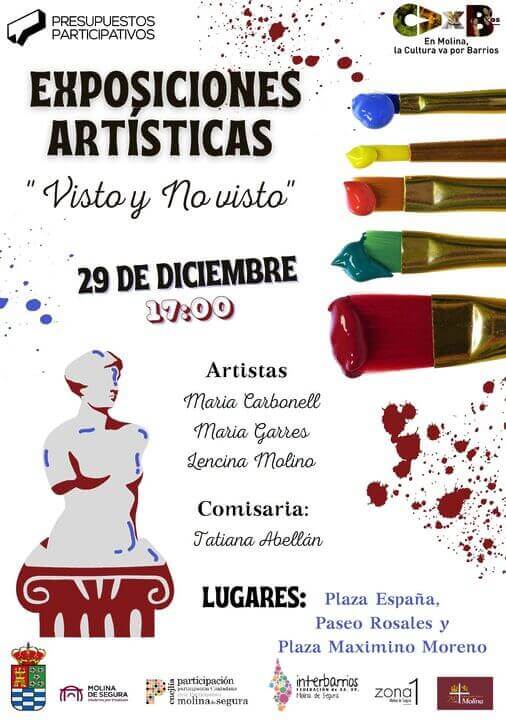El programa «En Molina, la Cultura va por Barrios» de la Concejalía de Participación Ciudadana, ha organizado, para el jueves 29 de diciembre, a partir de las 17.00 horas, las exposiciones al aire libre «Visto y no visto», un proyecto artístico que mostrará en la Plaza Maximino Moreno, el Paseo Rosales y la Plaza de España las creaciones de María Carbonell, María Garres y Lencina Molino.
