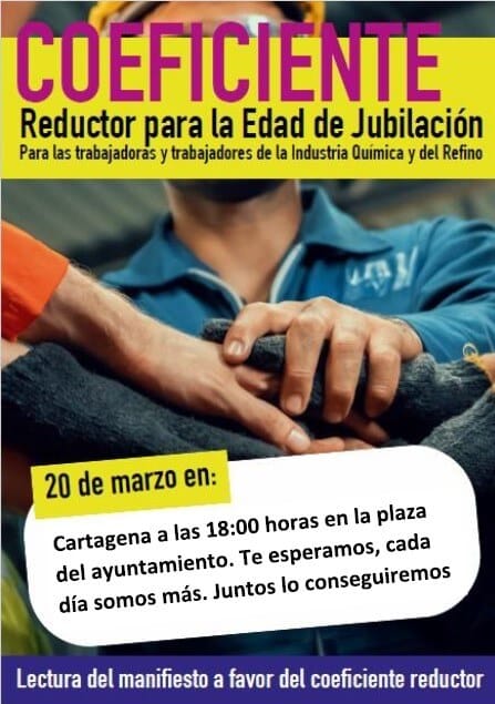 Es importante recordar que la asamblea para la consecución de un coeficiente reductor para los trabajadores de la industria química y el refino, esta compuesta por diferentes comités de empresa de diferentes opciones sindicales, por lo que animan a los diferentes participantes a lucir sus banderas y colores para hacer un acto donde se muestre la unidad y la fuerza que hacen los trabajadores para poder conseguir el objetivo, ahora que el gobierno de España, se ha abierto a revisar las profesiones susceptibles de poder acogerse a los coeficientes reductores de jubilación.