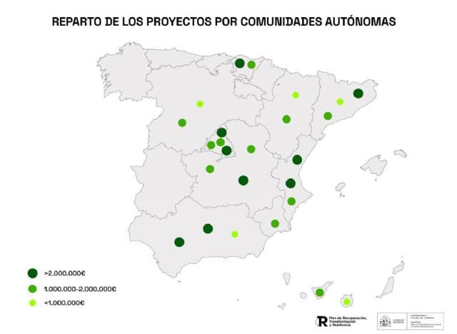 Los proyectos elegidos se ubican en 10 comunidades autónomas. Madrid es la región que recibe la mayor dotación -8,10 millones-, para un mayor número de proyectos -cuatro-. Le siguen la Comunidad Valenciana -6,89 millones y tres proyectos-; Andalucía, -6,31 millones y tres proyectos-; País Vasco, -6,06 millones y 2 proyectos-; y Castilla-La Mancha – 5,34 millones y tres proyectos-.