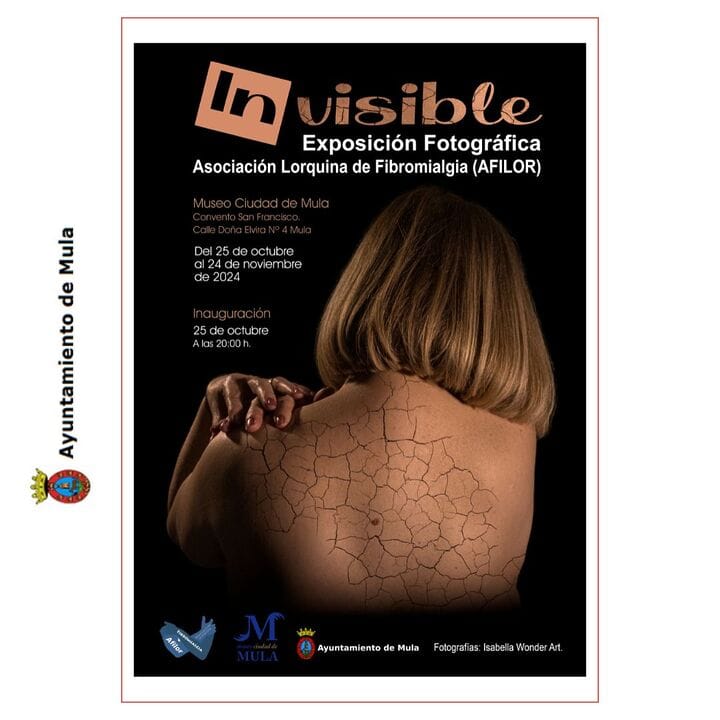 El próximo viernes 25 de octubre a las 20:00 horas se inaugurará en el Museo Ciudad de Mula la exposición fotográfica «Invisibles», organizada por la Asociación Lorquina de Fibromialgia (AFILOR) con la colaboración de las concejalías de Cultura e Igualdad del Ayuntamiento de Mula