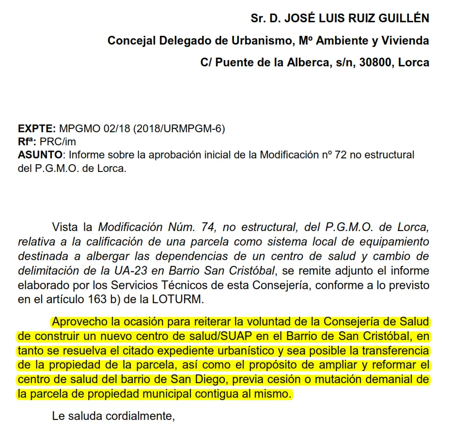 Casalduero sostiene que el PP de Lorca y el Gobierno regional, con el “silencio cómplice” de Vox y del alcalde Fulgencio Gil, están “jugando con la salud de miles de personas” para ocultar su falta de voluntad política. La edil recuerda que la construcción de este centro sanitario se arrastra desde 2010, sin avances reales.