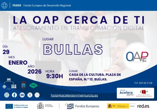 El municipio de Bullas será el próximo 29 de enero una de las paradas de la iniciativa “La OAP cerca de ti. Asesoramiento en transformación digital”, impulsada por la Oficina Acelera Pyme Región de Murcia, con el objetivo de acercar la digitalización a pymes, personas autónomas y emprendedoras del municipio y su entorno más próximo.