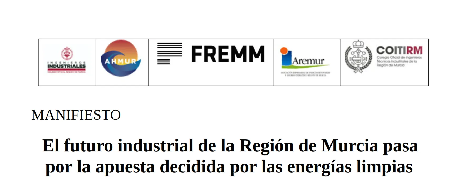 El manifiesto está respaldado por AREMUR (Asociación de Empresarios de Energías Renovables), la Asociación de Empresas Productoras del Hidrógeno Verde (AHMUR) y los colegios de ingenieros industriales y técnicos industriales. El mensaje se atribuye también a sus representantes: Francisco Espín (presidente de AREMUR), Eduardo Piné (presidente de AHMUR) y los decanos Miguel Ángel Sola (COITIRM) y Marcos Mateo (COIIRM), que coinciden en la necesidad de elevar el debate energético y sostenerlo en criterios técnicos, objetivos y diálogo social.