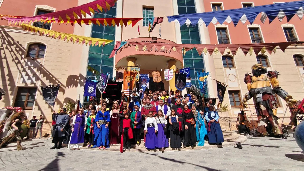 La primera gran imagen de este 25 aniversario se produjo en las calles del centro urbano, donde el gran Mercado Medieval abrió sus puertas con una puesta en escena que mezcló animación, ambientación histórica y participación festera. Un gigante avanzando entre el público, acompañado de música medieval, fue uno de los elementos más llamativos de una inauguración en la que la corporación municipal recorrió el trayecto junto a las peñas cristianas y berberiscas desde el Campamento Festero hasta las calles que acogieron el mercado.